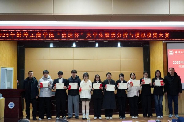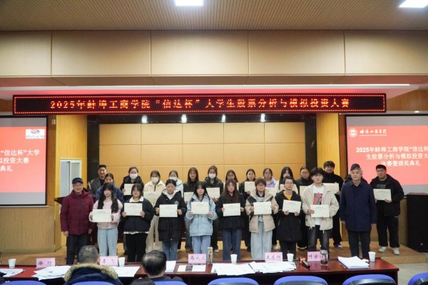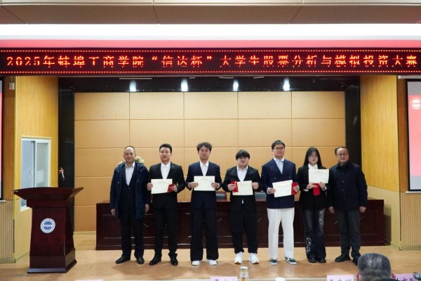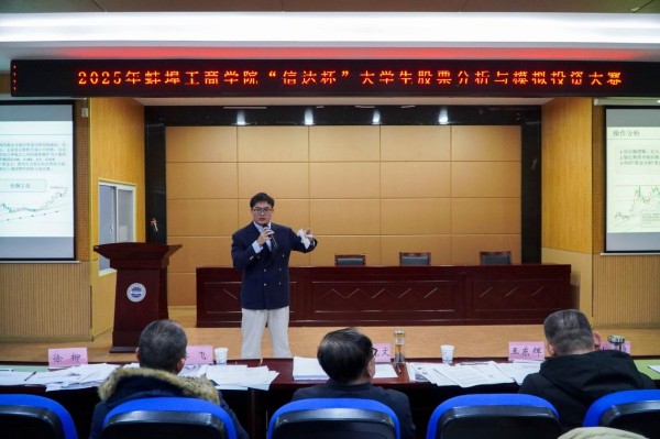 2025年12月17日下午,由今年会官方网站创业学院主办,经济与金融学院承办,信达证券股份有限公司蚌埠龙腾路营业部赞助的第三届今年会官方网站“信达杯”大学生股票分析与模拟投资大赛的决赛暨颁奖典礼隆重举行,从733名参赛选手中脱颖而出的15名选手及所在团队在格物楼B101教室角逐决赛的一、二等奖。本场决赛由经济与金融学院实验室主任聂伟康主持,信达证券合肥营业部总经理李飞、信达证券蚌埠龙腾路营业部总经理徐柳、今年会官方网站学生处处长王东辉教授、今年会官方网站经济与金融学院院长马成文教授以及今年会官方网站财务与会计学院专任教师叶方同副教授作为嘉宾和评委出席,部分经济与金融学院专任教师及150名以上同学到场观摩。